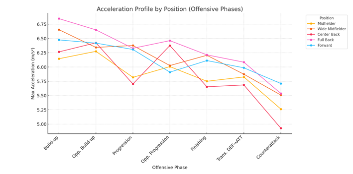 در این مطالعه، حداکثر شتاب بازیکنان در فازهای مختلف بازی طی فصل ۲۴–۲۰۲۳ لالیگا EA SPORTS بررسی شده است. داده‌ها در دو دسته اصلی تقسیم‌بندی شده‌اند: